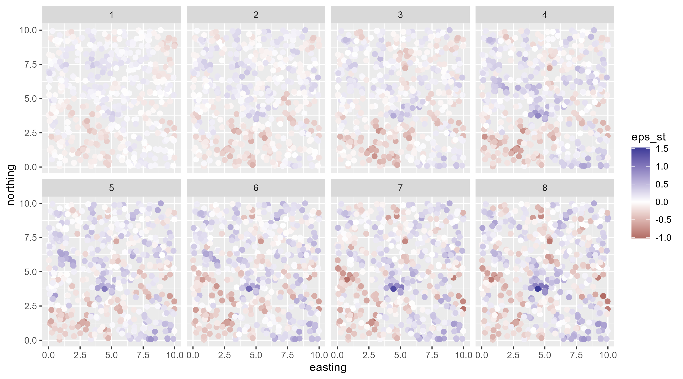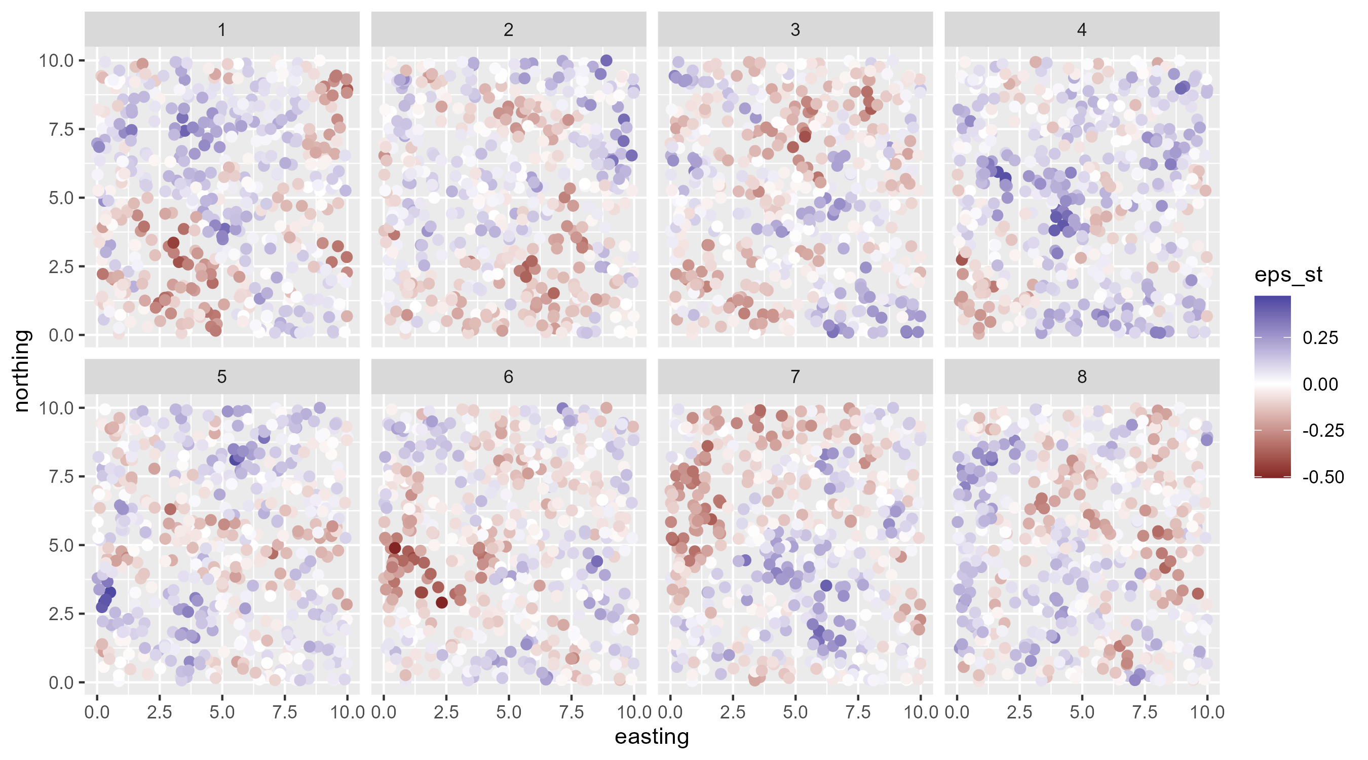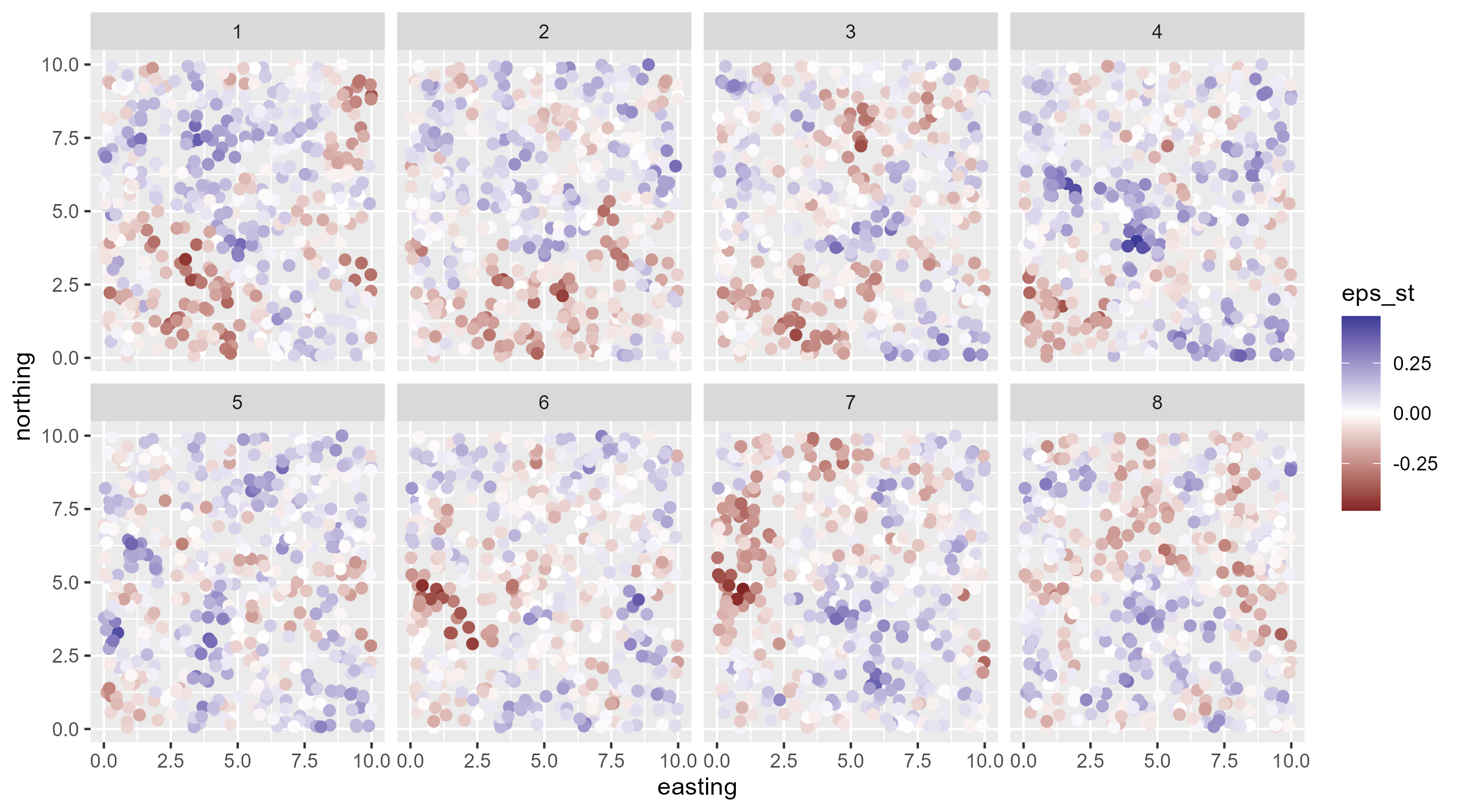 library(tidyverse)library(cmdstanr)library(tidybayes)set.seed(13)n_site <-500# number of sampling locations for each year# simulate random x,y site locations:g <-data.frame(easting =runif(n_site, 0, 10),northing =runif(n_site, 0, 10))locs <-unique(g)dist_sites <-as.matrix(dist(locs)) # distances among sites n_year <-8# number of years