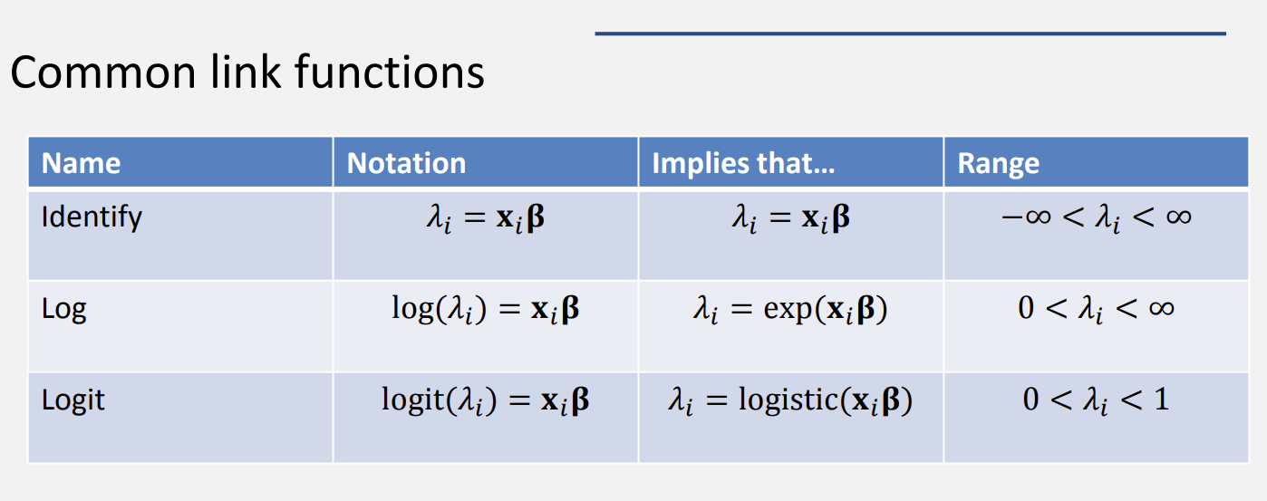 We generally describe a GLM for a response \(y_{i}\) in terms of three things: