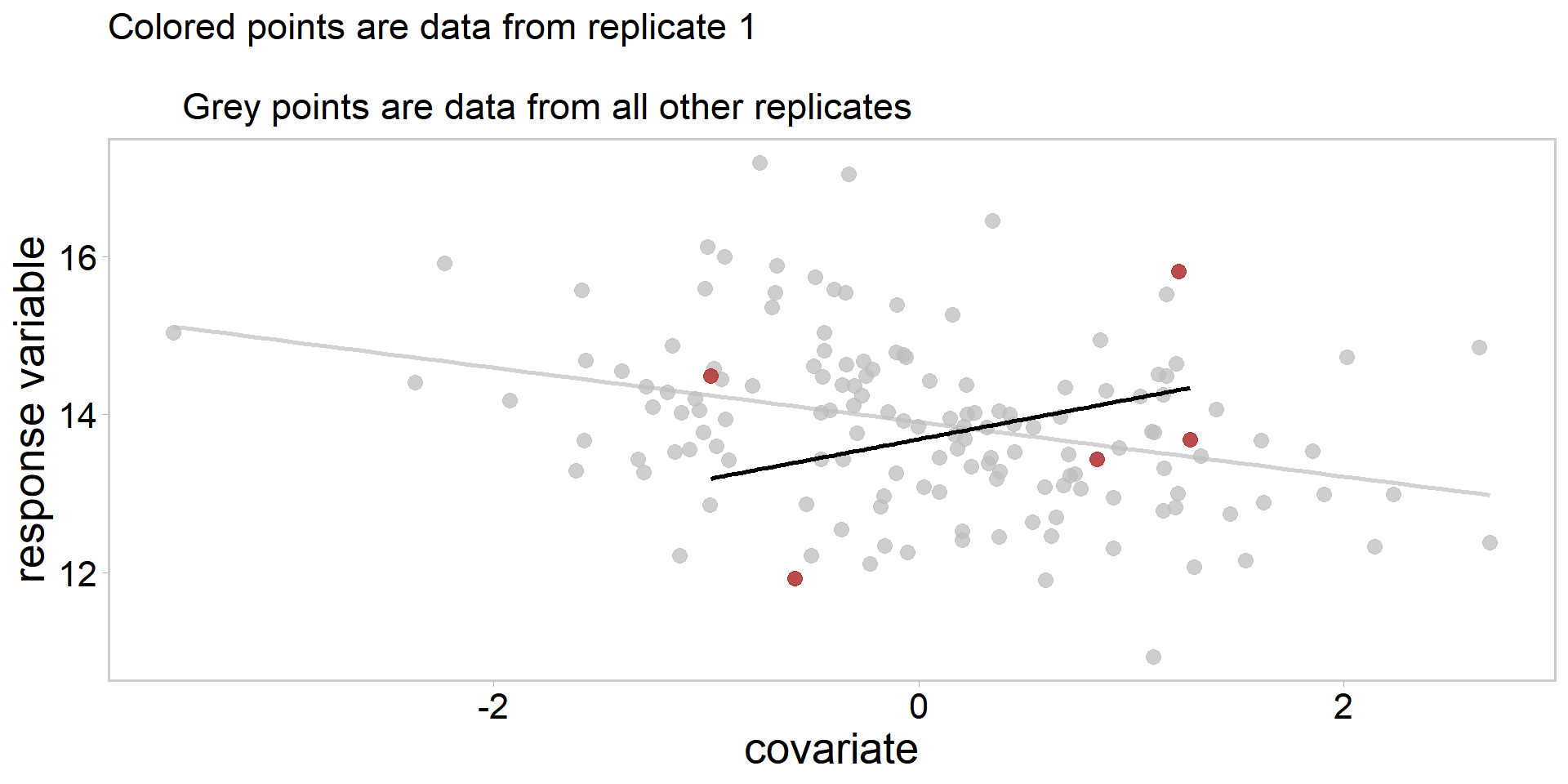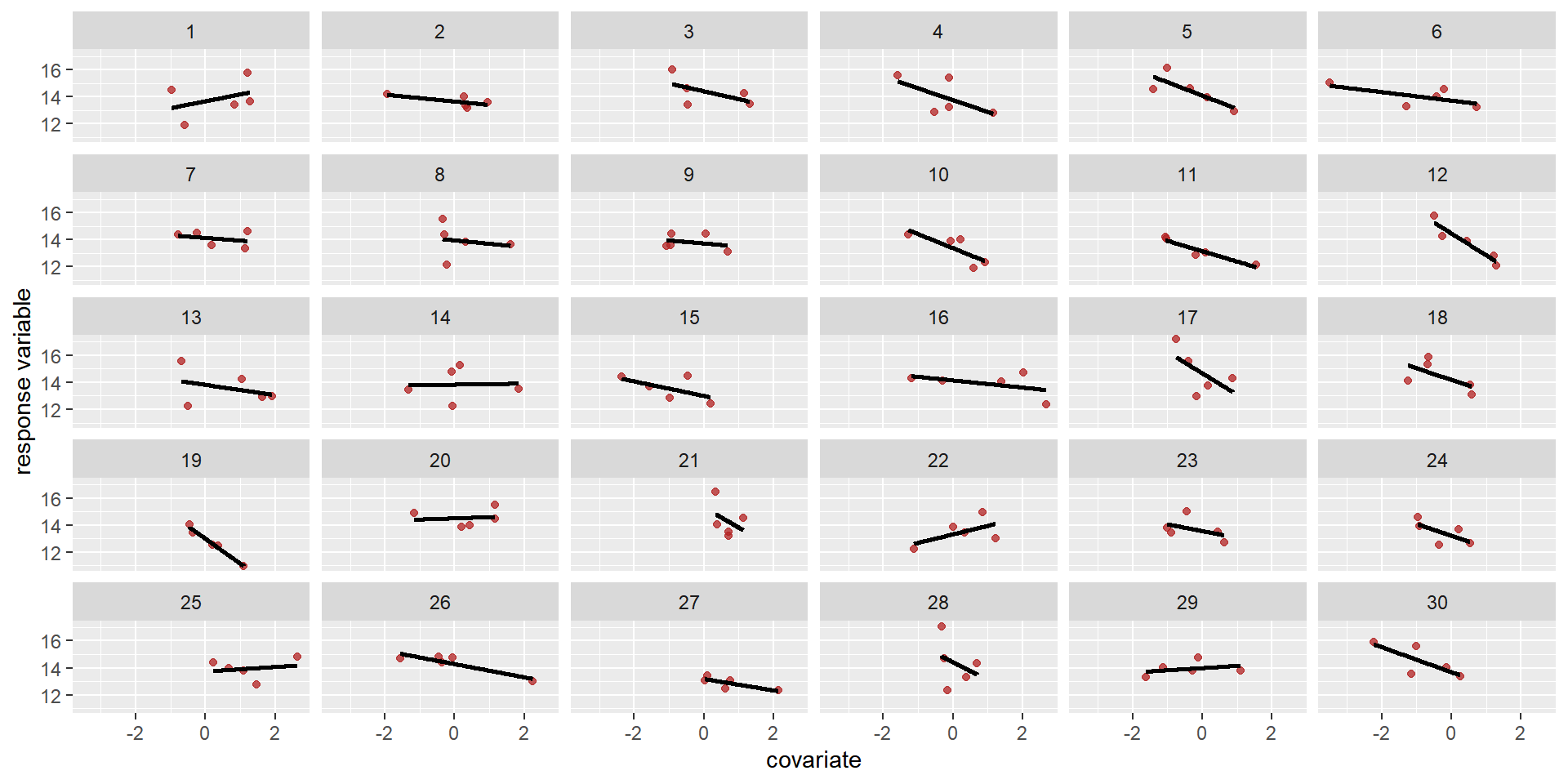 \[ \begin{array}{l}\begin{aligned}\beta_{0} & \sim \operatorname{Normal}(0,25) & \text { [prior for average intercept] }\\ \beta_{1} & \sim \operatorname{Normal}(0,25) & \text { [prior for average slope] } \\ \sigma & \sim \operatorname{Exponential}(0.01) & \text { [prior for stddev within group] }\\ \sigma_{\beta_{0}} & \sim \operatorname{Exponential}(0.01) & \text{[prior stddev among intercepts]}\\ \sigma_{\beta_{1}} & \sim \operatorname{Exponential}(0.01) & \text{[prior stddev among intercepts]}\\ \mathbf{\Omega} & \sim \operatorname{LKJ} \operatorname{corr}(2) & \text{[prior for correlation matrix]} \end{aligned}\\ \end{array} \]