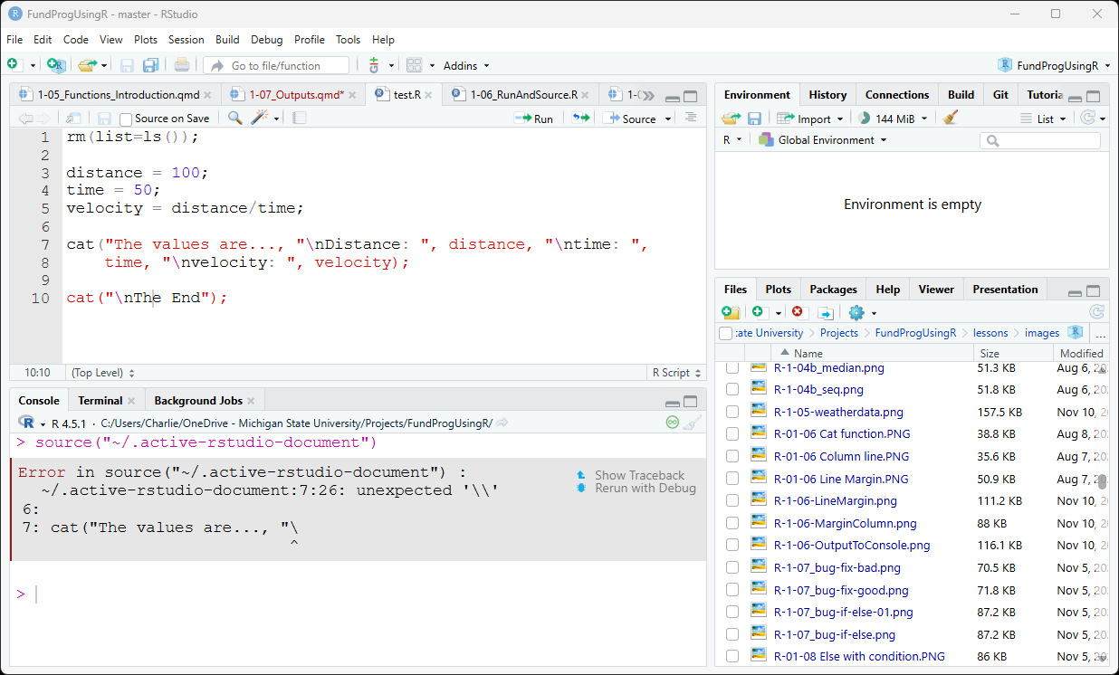 We will first use cat() to output a text message to the Console tab – to do this we need to put the message in quotes: