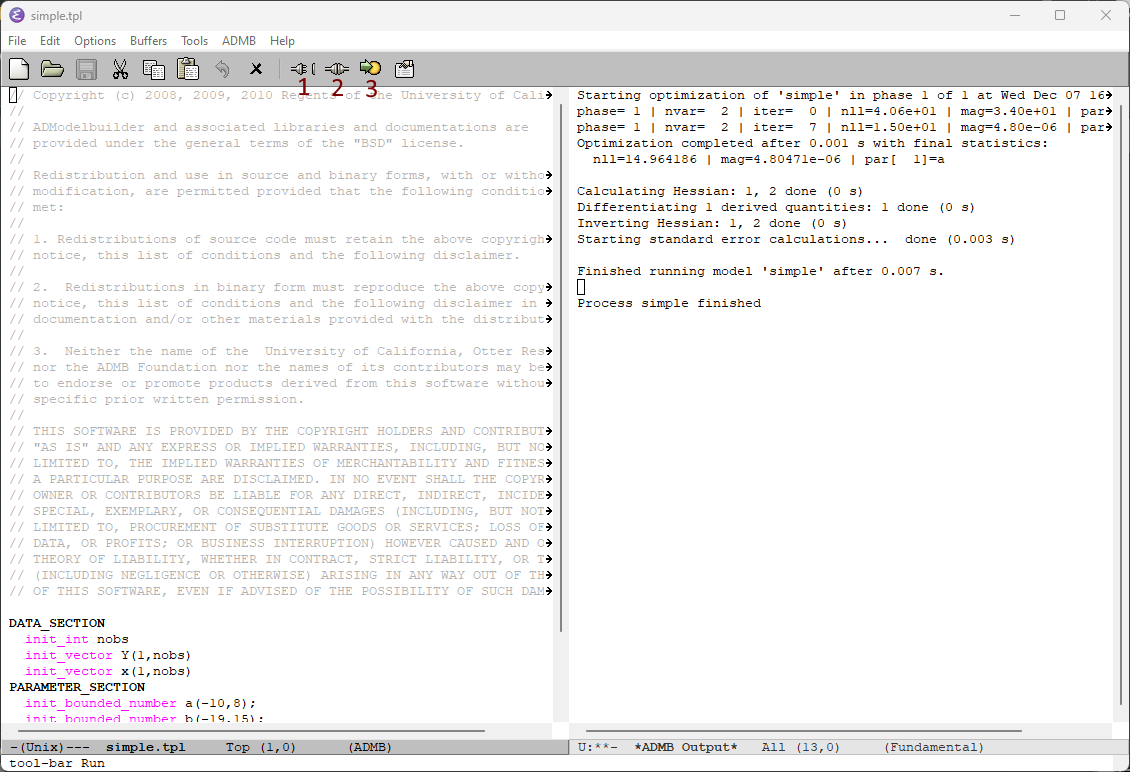 If the Emacs panels look like this after Run, then ADMB is properly installed: