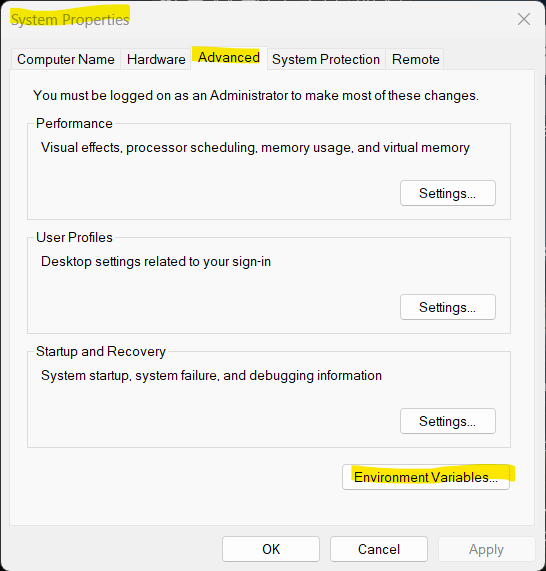 That will open the System Properties window on the Advanced tab– click on the Environment… button: