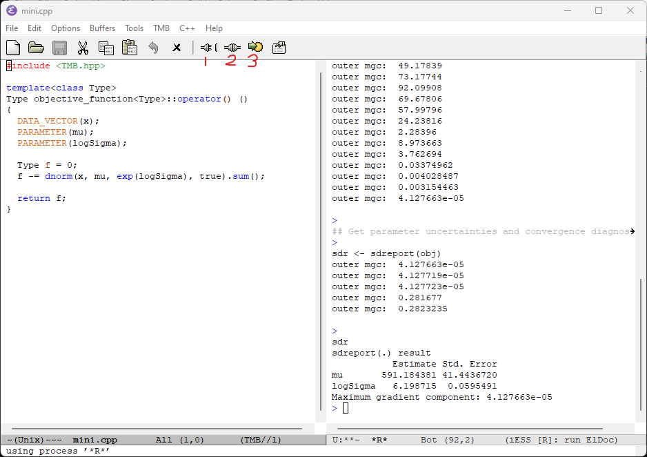 If the Emacs panels look like this after Run, then TMB is properly installed: