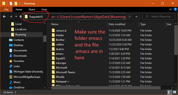 The easiest way to get to the user’s appdata folder is to type %appdata% in a File Explorer window and hit enter. Or, you can go directly to the folder: C:\Users\<yourUserName>\AppData\Roaming. Move both the emacs folder and .emacs file to this folder: